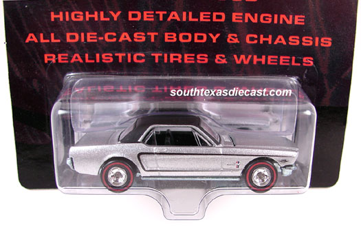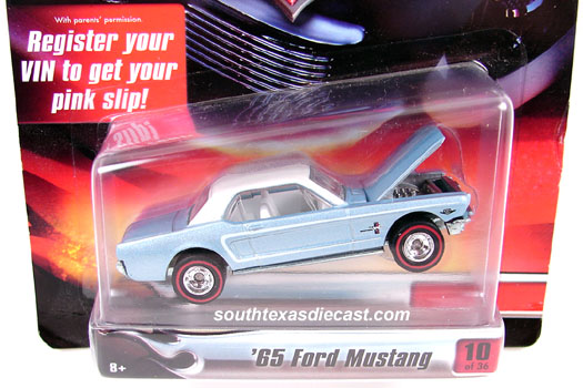 Mtflk. Lt. Blue, w/White stripe on sides, Mustang logo on sides, White Interior, Unpainted Thailand Base, w/RLRR's