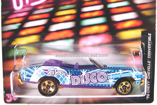 Mtflk. Blue, w/Lt. Blue & White stripes on sides, hood, & trunk, disco ball, 'DISCO', & HW logo on sides, Purple Interior, Gold Chrome Malaysia Base, w/Gold5SP's