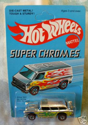 1976 Super Chromes | Chrome, w/Yellow, Green, & Blue tampos, Black interior, Blue Tint Window, Opening hood, Unpainted Hong Kong Base, w/RL's | $55.00 | $75.00 |