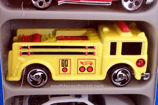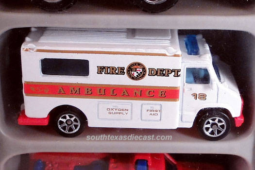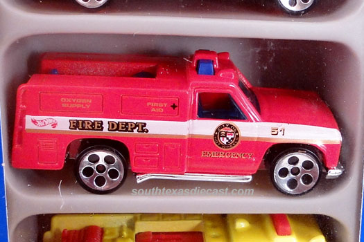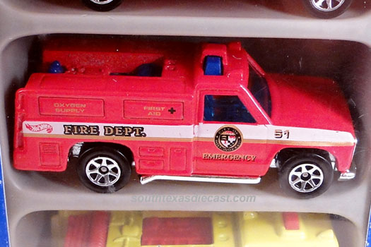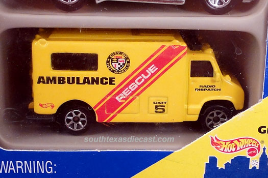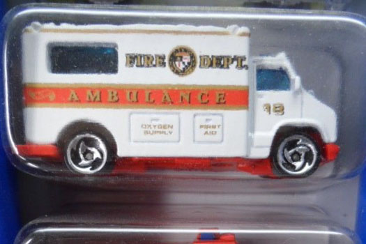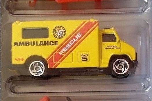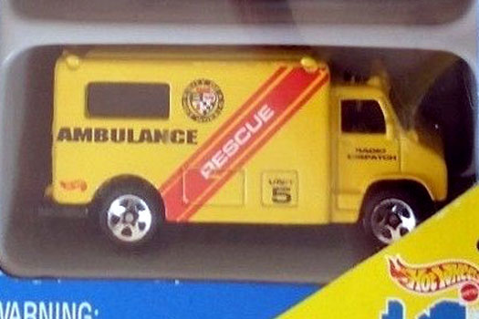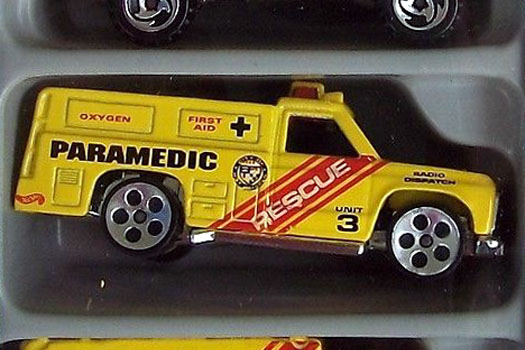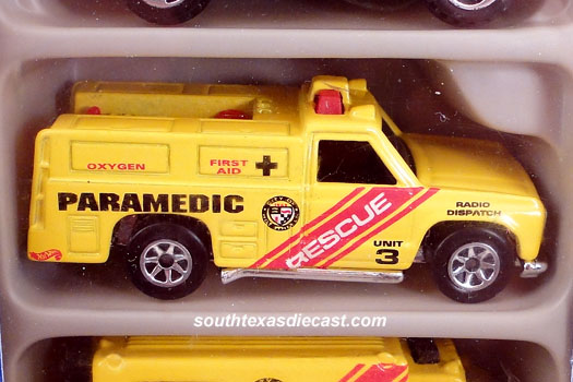 1997 Rescue Squad 5-Pk | Yellow, w/Red stripes, 'Rescue', 'Paramedic', & 'Unit 3' on sides, Black interior, Chrome Malaysia Base, w/7SP's | $1.00 | ||