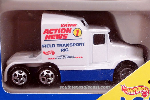 Big Rig | 1997 Action News Team 5-Pk | Pearl White, w/Yellow, Red, & Blue tampos, 'Action News', 'KHWW', '1', & 'Field Transport Rig' on sides, Blue Malaysia Base, w/5DOT's | $2.00 | ||