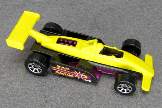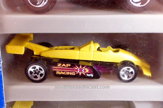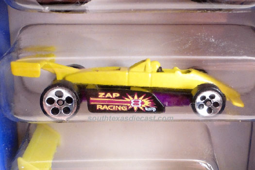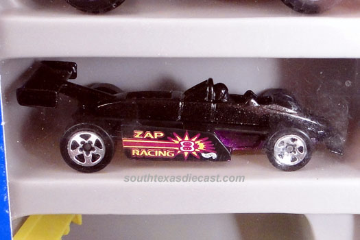 1997 Racing World 5-Pk | Mtflk. Black, w/Yellow & Magenta 'Zap Racing' & White '8' on sides, Black interior, Mtflk. Purple Malaysia Base, w/5SP's | $1.00 | ||