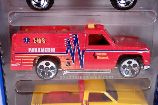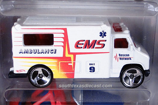 2001 Rescue Rods 5-Pk | White, w/Red & Yellow stripes, 'Ambulance', 'EMS', 'Unit 9', & 'Rescue Network' on sides, Red interior, Dk. Blue Thailand Base, w/3SP's | $1.00 | ||