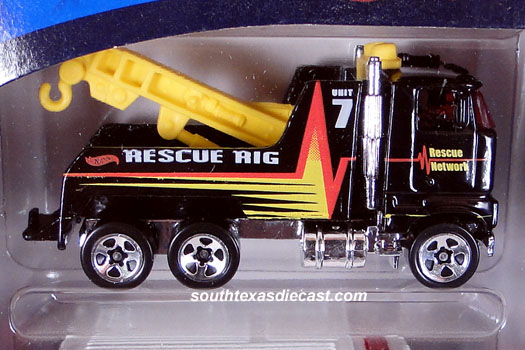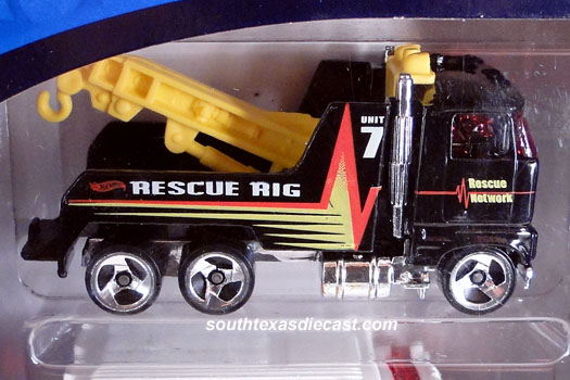 2001 Rescue Rods 5-Pk | Black, w/Red & Yellow stripes, 'Rescue Rig', 'Unit 7', & 'Rescue Network' on sides, Chrome interior, Chrome Thailand Base, w/5SP's | $1.00 | ||