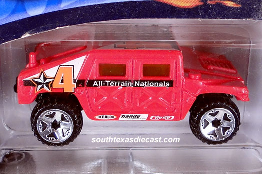 2002 4x4 Monsters 5-Pk | Red, w/White, Orange, Black, & Silver tampos, 'All Terrain Nationals' & race deco on sides, '4' on sides & roof, Black Thailand Base, w/OR5SP's | $1.00 | ||