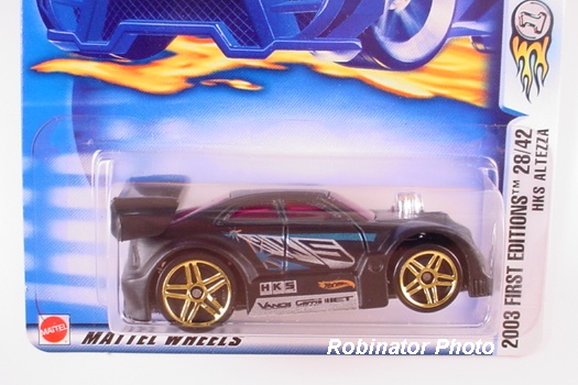 HKS Alteza | 2003 First Editions #28 | Matte Black, w/Silver, Blue, & Orange tampos, 'HK5' on sides & hood, Chrome interior, Black Malaysia Base, w/PR5's | $0.50 | $1.00 |