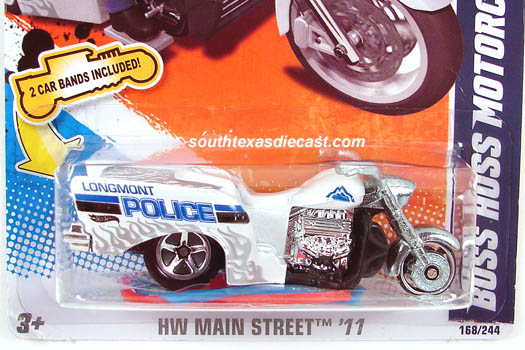 2011 HW Main Street #08 | Pearl White, w/Silver flames on sides & top, Blue & Black stripes & 'Longmont Police' on sides, Black Malaysia Base, w/5SP/MC5's | $0.00 | $0.00 |