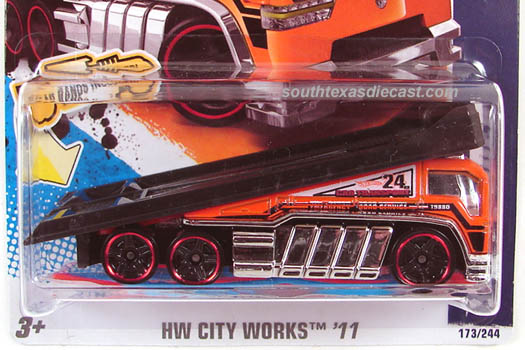2011 HW City Works #03 | Orange, w/White, Black, & Red tampos, '24 Hr Car Transport' on sides, Black Malaysia Base, w/ChrRed/BlackPR5's | $0.00 | $0.00 |