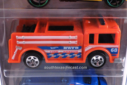 2015 Rescue Racers 5-Pack | Orange, w/Blue & White stripes, 'HWFD', 'Fire Rescue', & '68' on sides, Mtflk. Silver Thailand Base, w/5SP's | $0.00 | ||