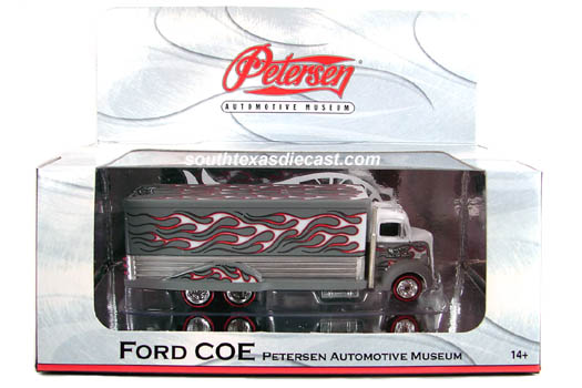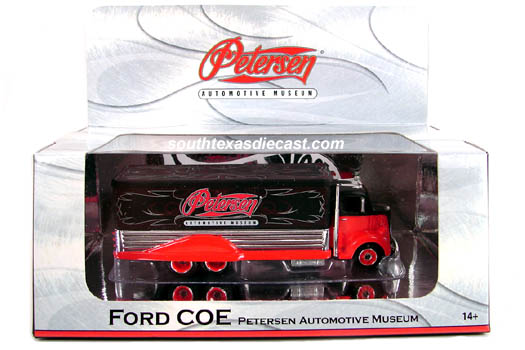 Black & Red, Black & Red box, Red & White pinstripe design on sides & across top, Petersen Museum logo on sides