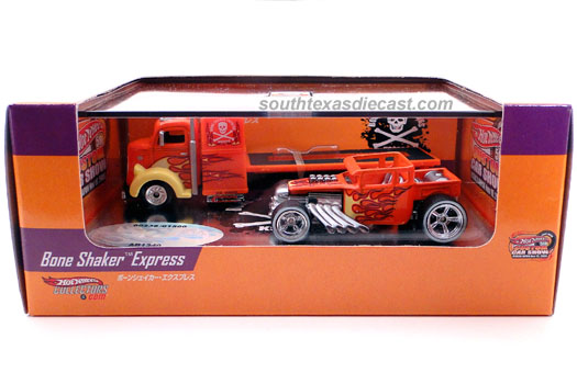 Orange, w/Yellow, White, & Red flames on sides, Skull & Crossbones, 'Bone Shaker Express' on sides, Black China Base, w/CC's