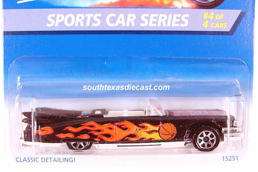 '59 Caddy | 1996 Sports Car Series #4 | Black, w/Red, Orange, & Yellow tampos w/flames & basketball on sides, 'Slam Dunk' on hood, Red HW logo on front windshield, White Interior, Chrome Malaysia Base, w/WL7SP's | $25.00 | $50.00 |