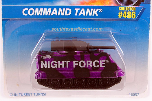 1996 Hot Wheels #486 | Black & Mtflk. Purple, w/Silver HW logo & 'Night Force' on sides, none interior, Black China Base, w/MW's | $1.00 | $2.00 |