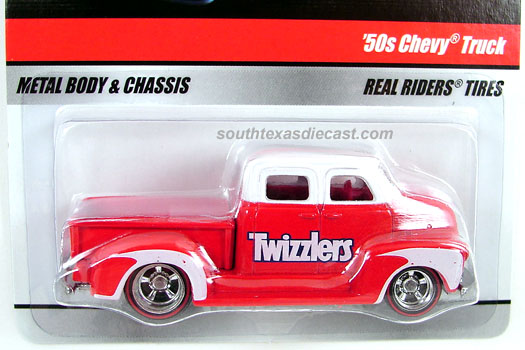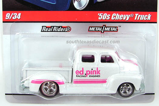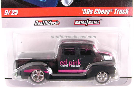 Spectraflame Brown, w/Silver & Gold tampos on sides & top w/'Real Riders', Hot Wheels logo, & '50' tampos on sides, Hot Wheels logo on bed, Tan Interior, Unpainted China Base, w/WWRR's