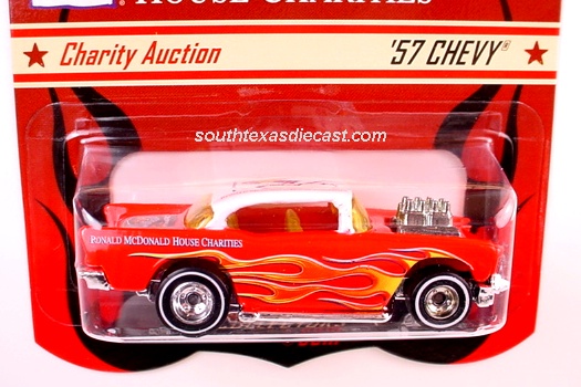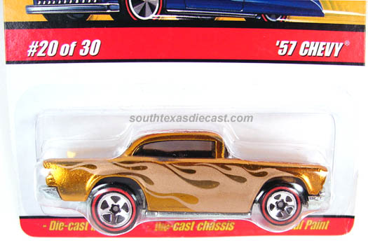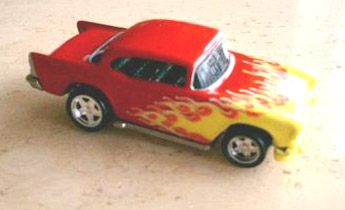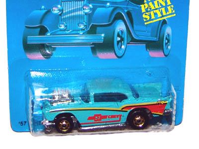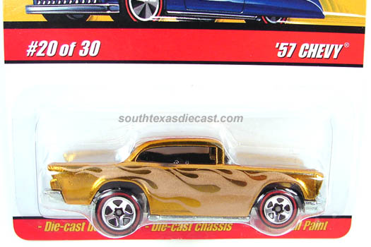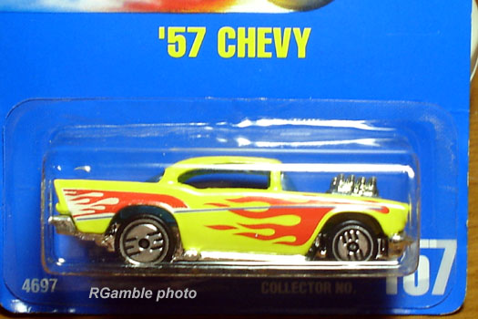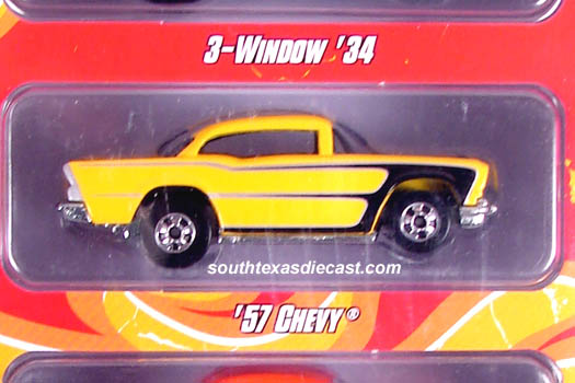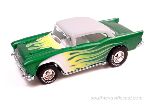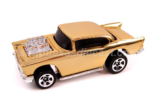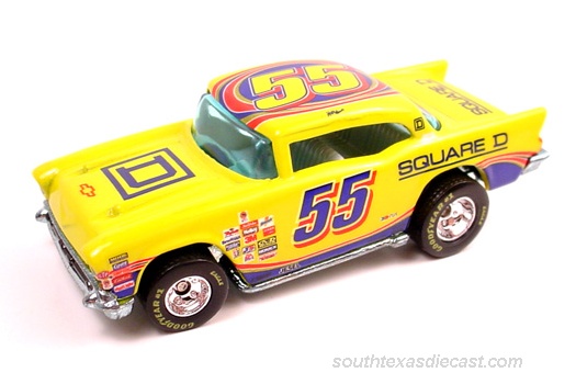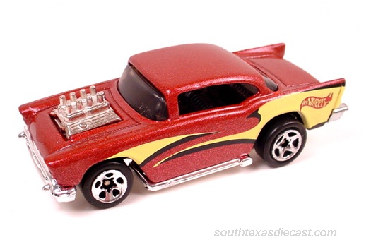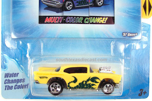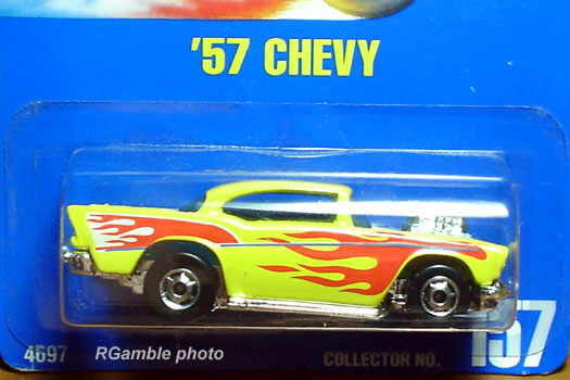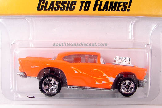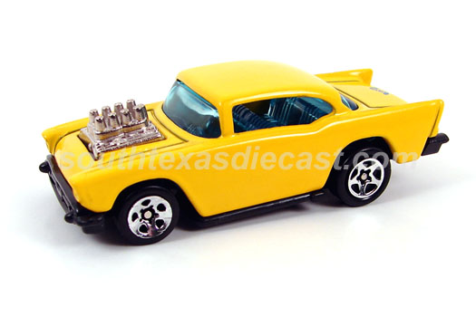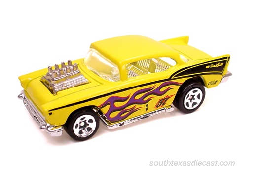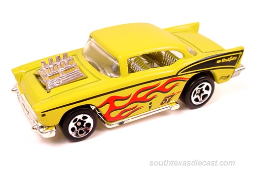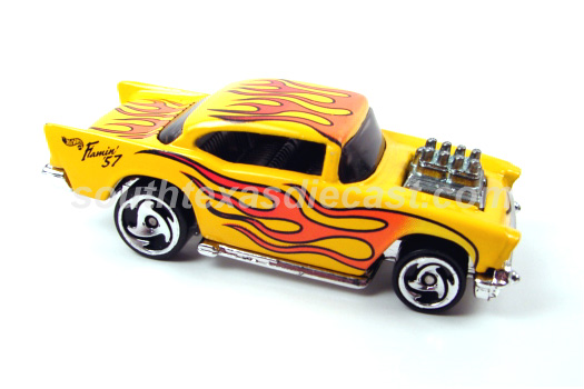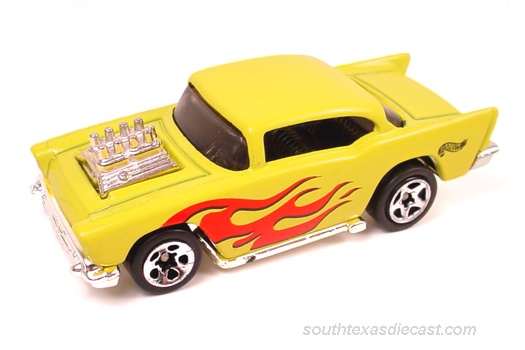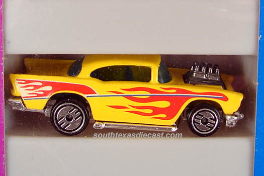 Yellow, w/Black, Orange, Red, & White tampos, flames, '57', chevy emblem, & 'Chevrolet' on sides, '57' on roof, chevy emblem on trunk, Clear Interior, Chrome Malaysia Base, w/5SP's