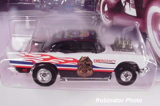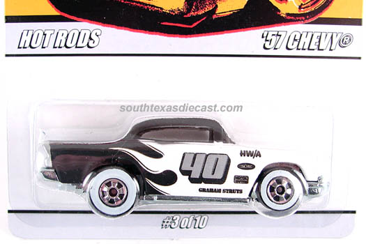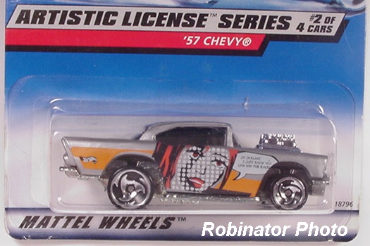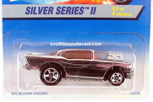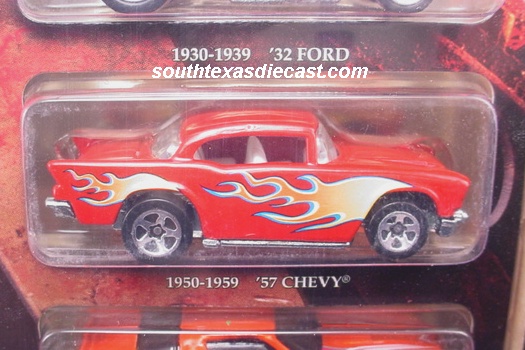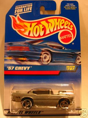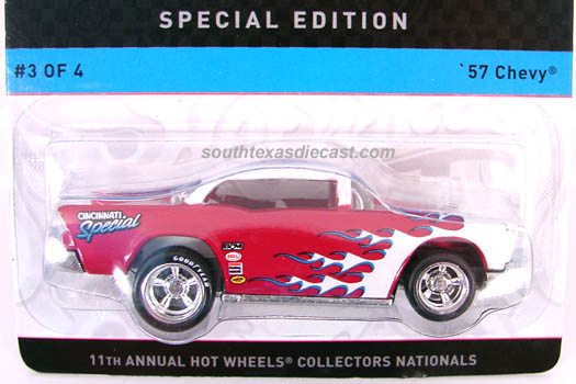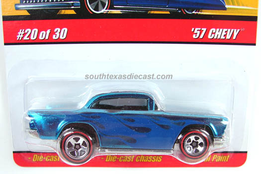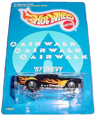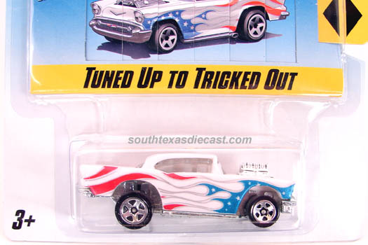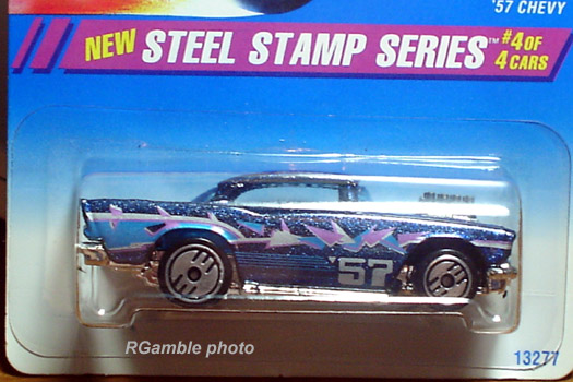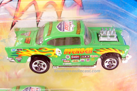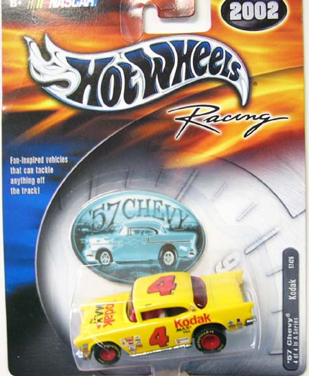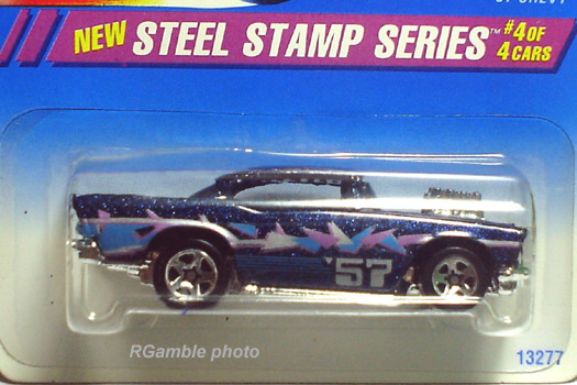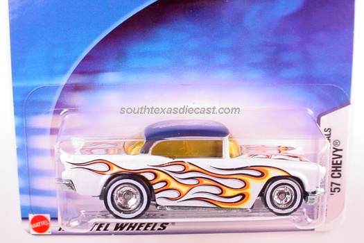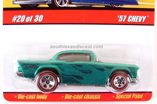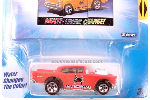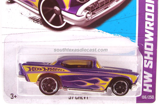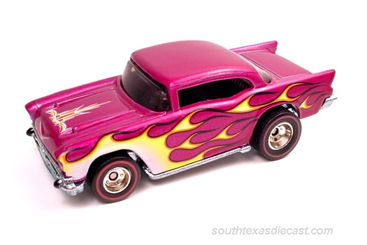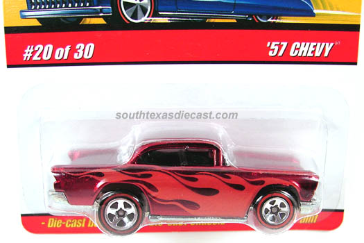 Yellow, w/Black, Orange, Red, & White tampos, flames, '57', chevy emblem, & 'Chevrolet' on sides, '57' on roof, chevy emblem on trunk, Clear Interior, Chrome Malaysia Base, w/5SP's