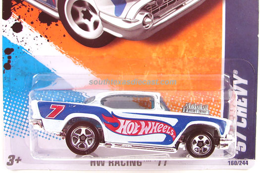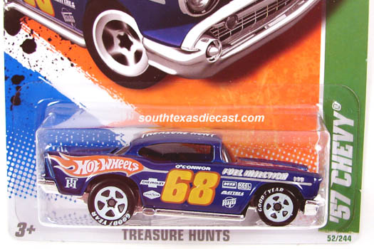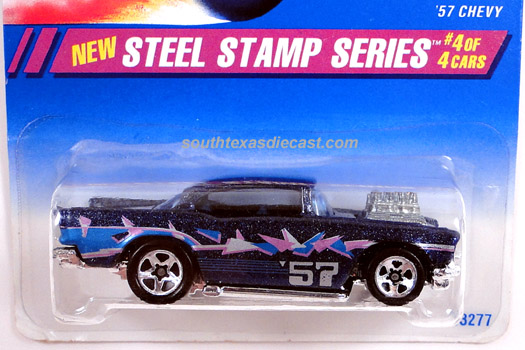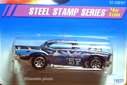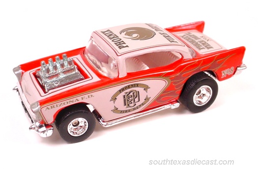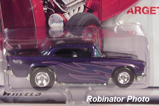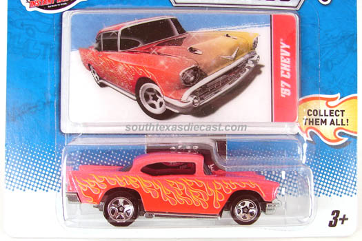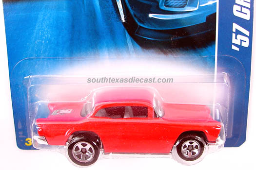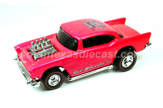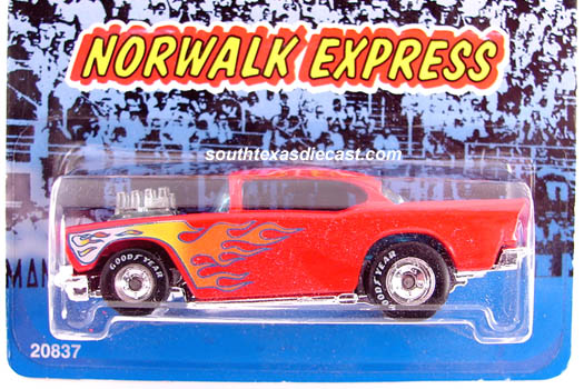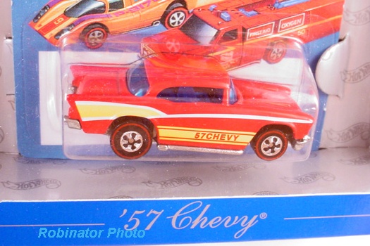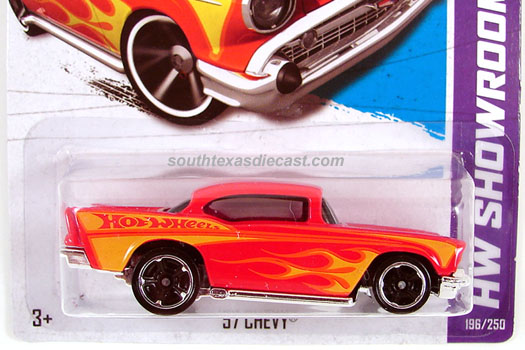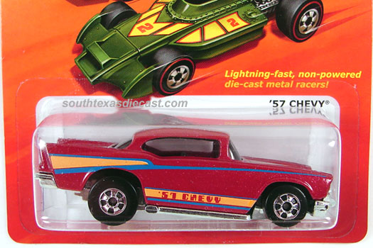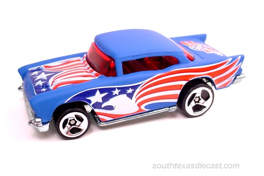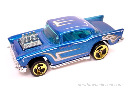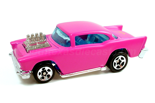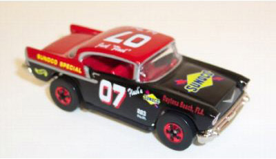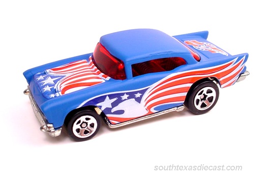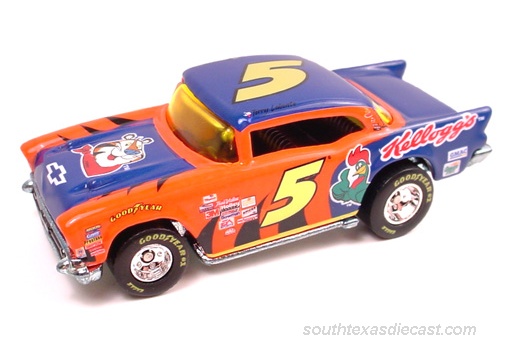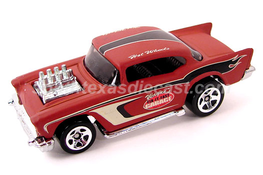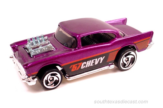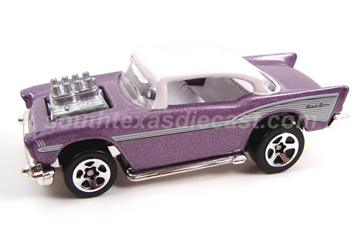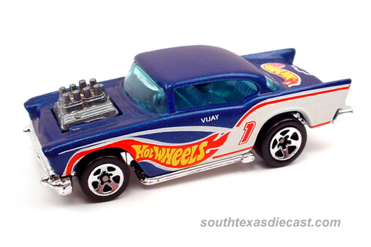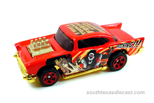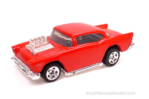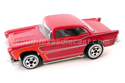 Mtflk. Dk. Red, w/Blue & Neon Lt. Orange stripes on sides, hood, & trunk, '57 Chevy' on sides, Black Interior, Unpainted Thailand Base, w/BW's