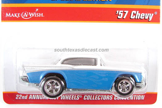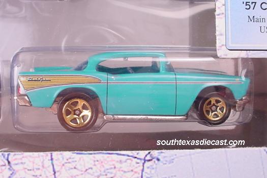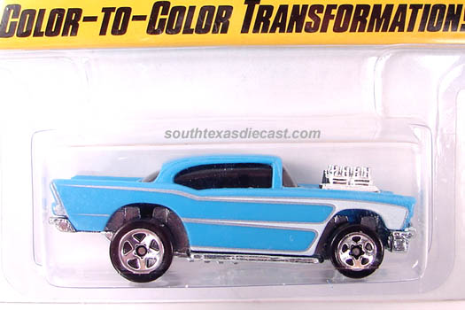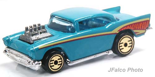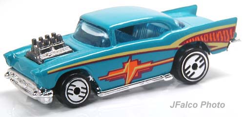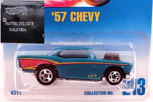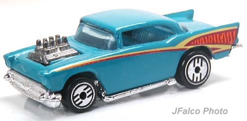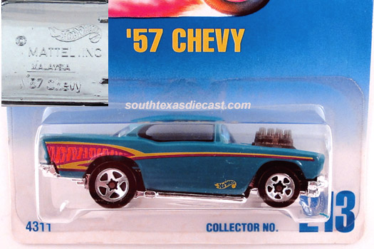 Turquoise, w/Yellow, Black, & Red tampo, '57 Chevy' on sides, Clear Blue interior, Chrome Malaysia Base, w/GHO's