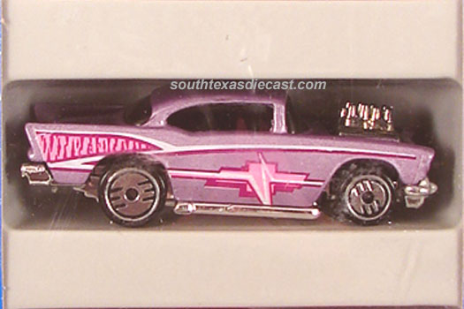 Mtflk. Midnight Blue, w/Pink, Blue, & Silver deco on sides, '57' on sides, Pink HW logo on rear window, Clear Blue interior, Blue Tint Window, Chrome Malaysia Base, w/UH's