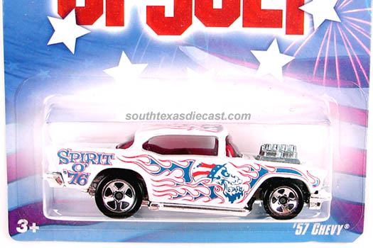 Pearl White, w/Red & Blue flames on sides & roof, 'Spirit of 76' on rear quarter panel , Chrome Malaysia Base, w/5SP's