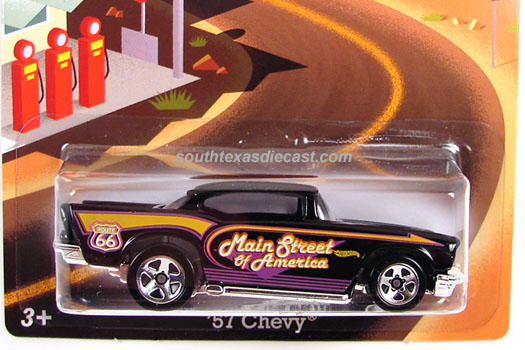 Black, w/Yellow & Magenta stripes on sides, hood, & trunk, 'Mainstreet of America' & Route 66 shield on sides, Clear Interior, Chrome Malaysia Base, w/5SP's