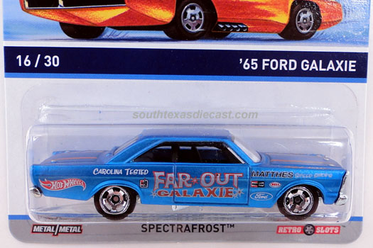 Spectrafrost Blue, w/Red & Silver 'Far Out Galaxie', race deco on sides, Red stripes on hood & trunk, '427 C.I.D.' on hood, Black Interior, Unpainted Thailand Base, w/RSW's