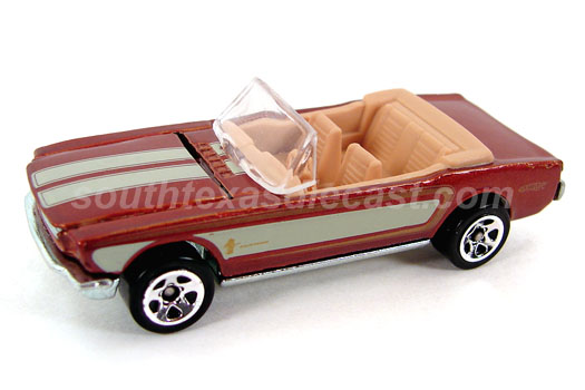 Dk. Red, w/Yellow stripes & 'Mustang' on sides, Beige interior, Clear Window, Unpainted Malaysia Base, w/WW's
