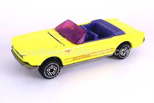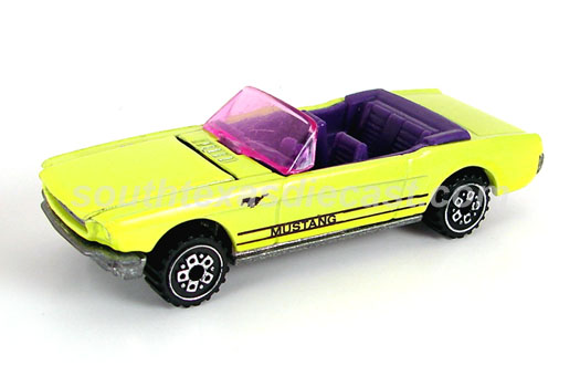 Flour. Yellow, Pinkish/Red tampos on sides w/'Mustang', Dk. Purple Interior, Unpainted Malaysia Base, w/SCW's
