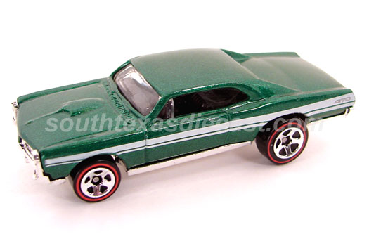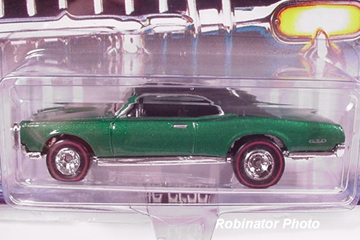 Mtflk. Dk. Green, w/Black roof, Gold stripe & Silver 'GTO' on sides, Clear Window, Black Interior, Chrome China Base, w/RLRR's