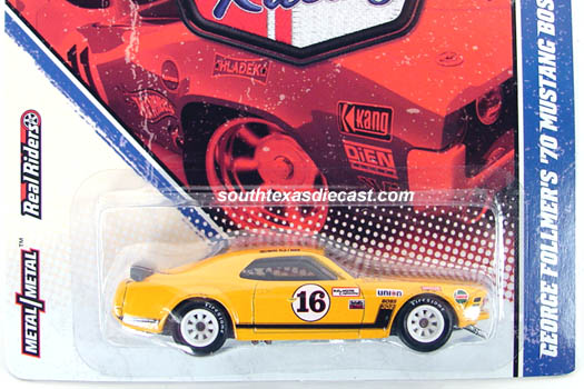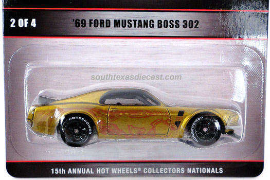 Satin Gold, w/Matte Black hood, Black stripe & Orange Mustang logo on sides, Nationals logo on roof, 'Horsepower' on tires, Unpainted Thailand Base, w/BlackRR5SP's
