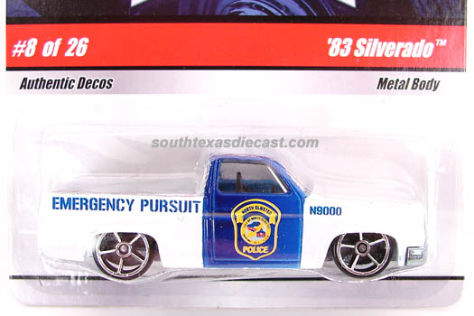 Pearl White & Blue, w/Yellow, Blue, White, & Red tampos, 'Emergency Pursuit' on sides, 'North Olmsted N9000' on roof, Black interior, Unpainted Thailand Base, w/OH5SP's