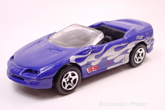 Mtflk. Blue, w/Black stripes across hood & trunk, Chevy emblem on hood, 'Camaro' on spoiler, Black Malaysia Base, w/5SP's