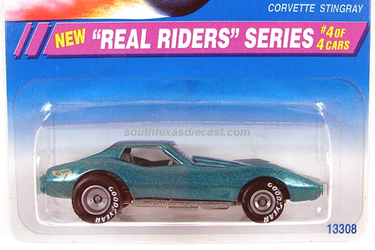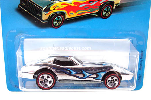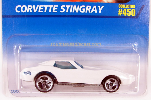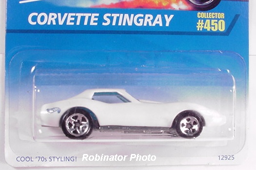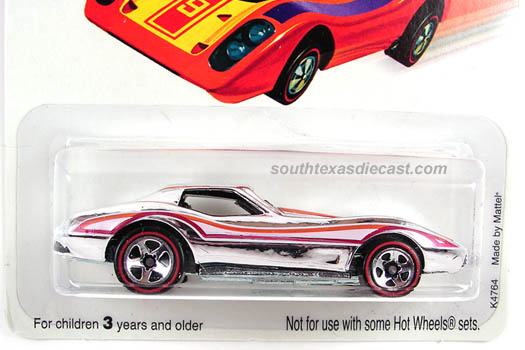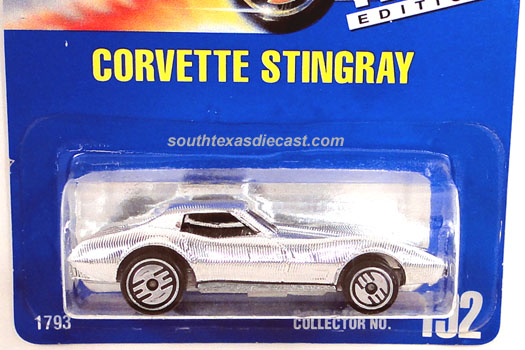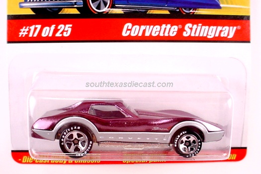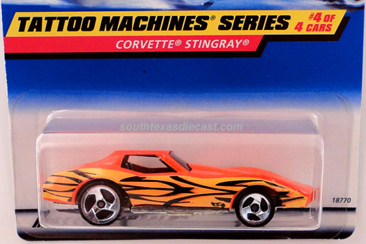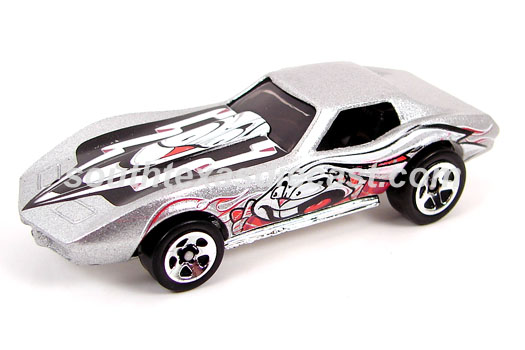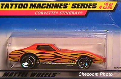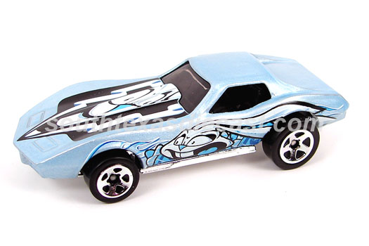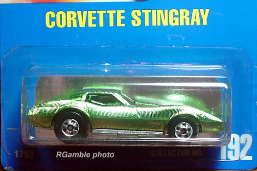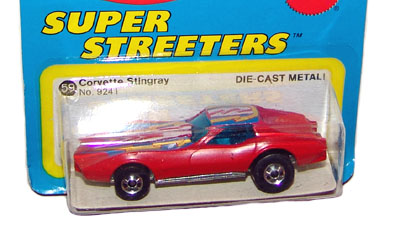 Mtflk. Grey, w/Magenta, Orange, & Yellow tampos on sides & across top, 'Stingray' on sides, 'Corvette' on hood, Black interior, Unpainted Malaysia Base, w/BW's