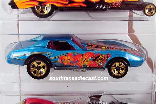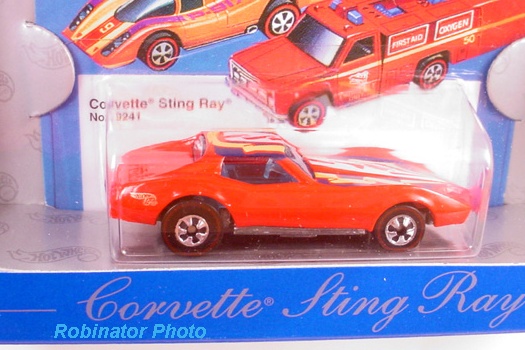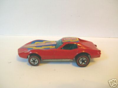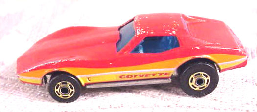 Red, w/Orange, White, & Yellow tampos w/'Corvette' on sides, Clear Blue interior, Blue Tint Window, Unpainted Hong Kong Base, w/GoldHO's