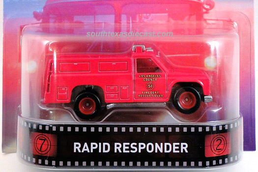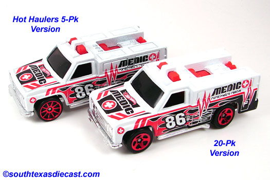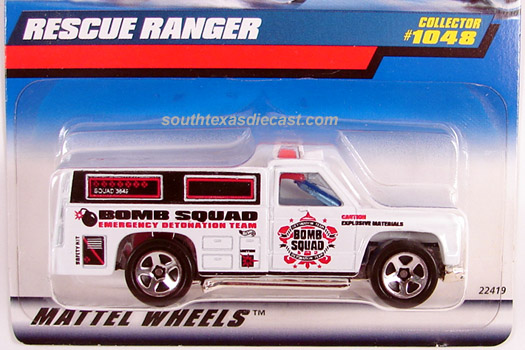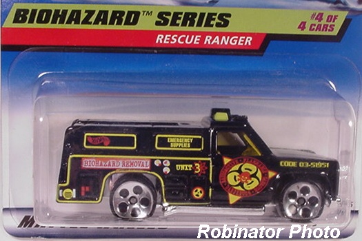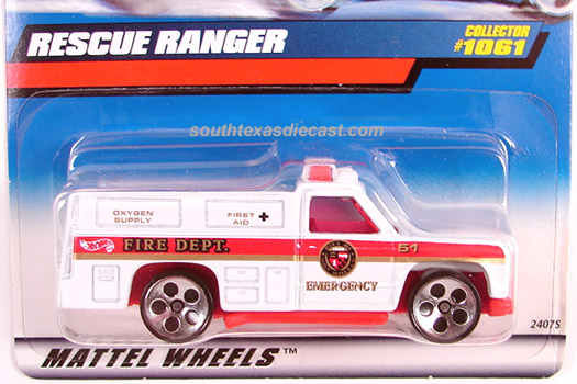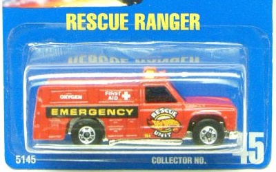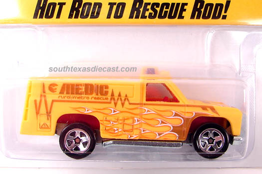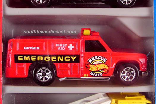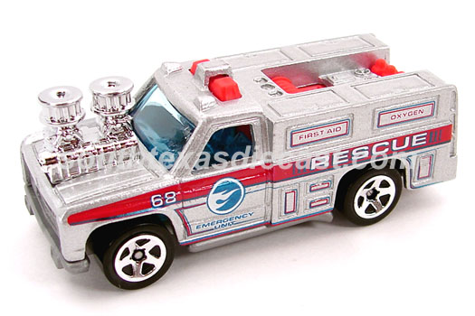 Red, w/Black, Yellow, & White tampos, 'Hot Wheels Rescue Unit 51' on doors, 'Emergency', 'First Aid', & 'Oxygen' on sides, Black interior, Chrome Malaysia Base, w/BW's