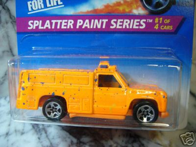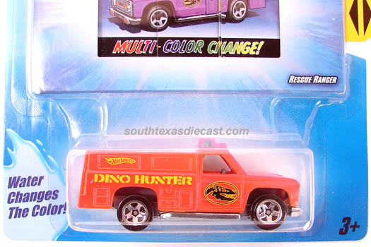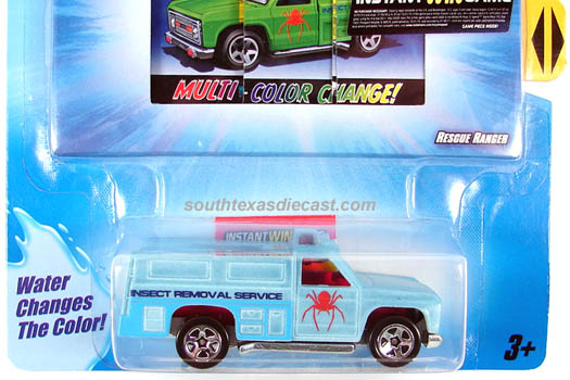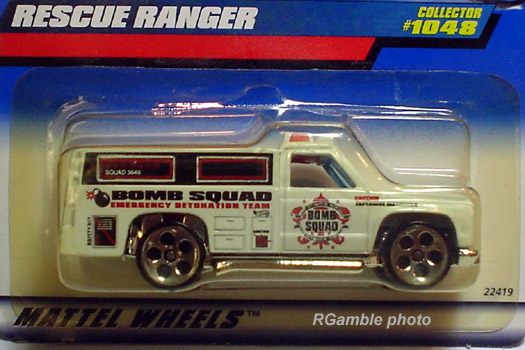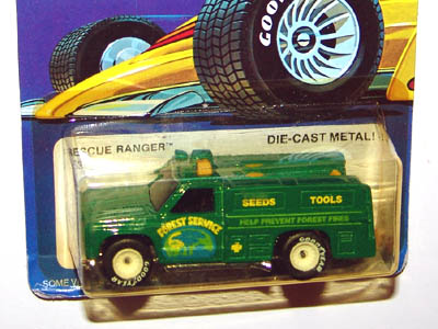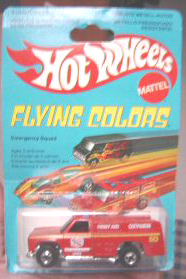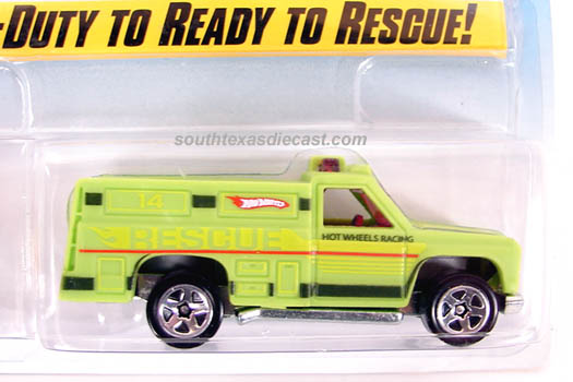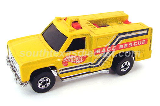 Yellow, w/Red, White, & Blue tampos, stripes, 'Race Rescue' & HW logo on sides, Black interior, Dk. Tint Window, Chrome Malaysia Base, w/BW's