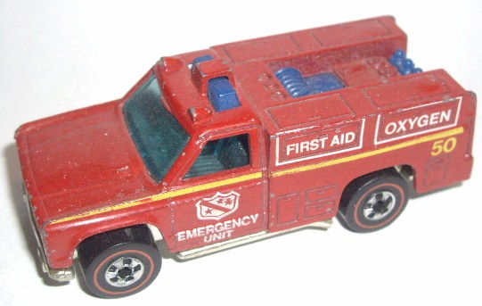 Red, w/Yellow & White tampos w/'Emergency Unit', 'Oxygen', & 'First Aid' on sides, Black interior, Tinted Window, Chrome Hong Kong Base, w/BW's
