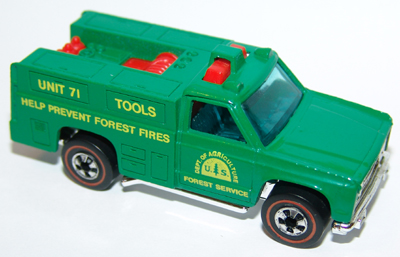 Green, w/Yellow tampos w/'Forest Service' & logo on door, 'Unit 71', 'Tools' & 'Help prevent forest fires' on sides, Brown interior, Tinted Window, Chrome Hong Kong Base, w/RL's