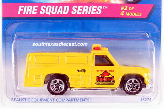 Yellow, w/Red & Black tampos w/'Fire Dept' & 'City of Hot Wheels' on sides, 'Fire Dept' on hood, Black Interior, Chrome Malaysia Base, w/5SP's