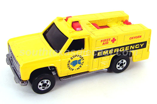 Yellow, w/Red stripes, 'Rescue', 'Paramedic', & 'Unit 3' on sides, Black interior, Chrome Malaysia Base, w/SB's