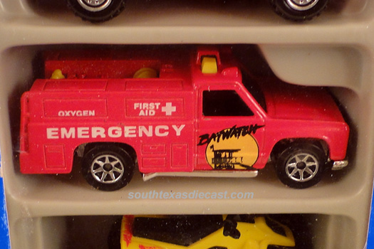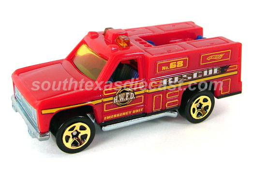 Red, w/Black, Yellow, & White tampos, 'Emergency' & 'HW Rescue Unit' on sides, Black interior, Black Window, Chrome Malaysia Base, w/7SP's