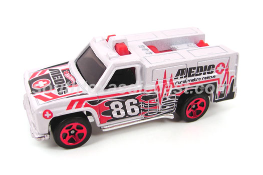 Pearl White, w/Red & Black tampos on sides & hood, 'Medic' on sides & hood, '86' on sides, Black interior, Silver China Base, w/ChrRed10SP's