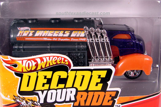 Mtflk. Purple w/Dk. Grey tank, Orange fenders, Orange stripes, Yellow & White 'Hot Wheels Oil' on sides, Grey Malaysia base, w/5SP's