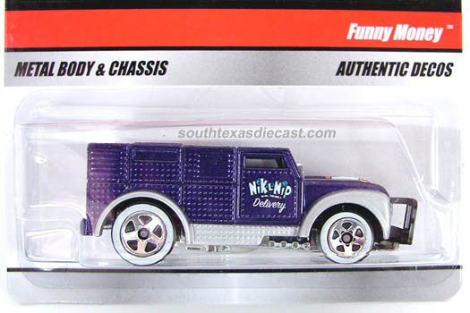 Spectraflame Orange, w/Black, Red, & White tampos, HW logo & 'Funny Money' on sides, Black Interior, Chrome Metal China Base, w/RR's