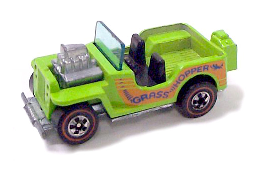 Lt. Green, w/Orange & Blue tampos w/'Grass Hopper' on sides, Black interior, Blue Tint Window, Unpainted Hong Kong Base, w/RL's