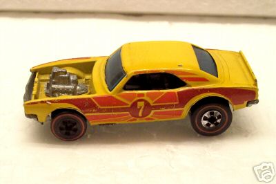 Yellow, w/Dk. Red, Dk. Orange, & Lt. Orange tampo on sides w/'7', Black interior, Blue Tint Window, Unpainted Hong Kong Base, w/RL's