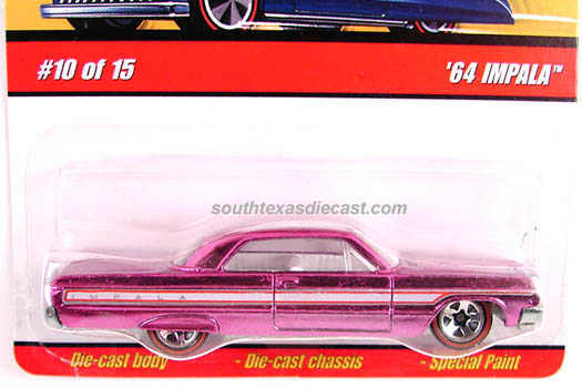 2008 Hot Wheels Classics #10 | Spectraflame Pink, w/Red, Silver, & White stripes w/'Impala' on sides, White Interior, Unpainted Thailand Base, w/RL5SP's | $0.00 | $0.00 | |