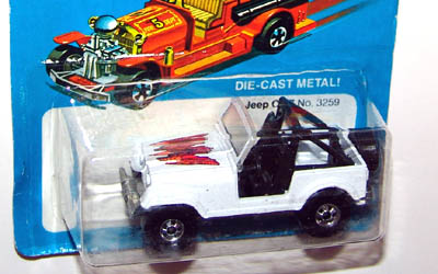 White, w/Maroon, Orange, & Red tampos w/ribbon & 'Jeep' on hood, Red interior, Clear Window, Unpainted Malaysia Base, w/WhiteHubORRR's