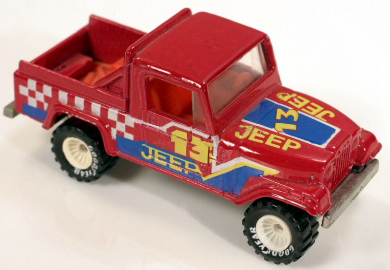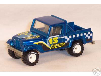 Mtflk. Blue, w/Yellow, Black, & White tampos w/stripes & 'Jeep' on sides, '13' & 'Jeep' on hood, Grey interior, Clear Window, Unpainted Malaysia Base, w/WhiteHubORRR's