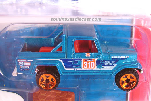 Mtflk. Blue, w/Orange & Gold tampos, stripes, 'Jeep', & 'Scrambler' on sides, Black Malaysia Base, w/RLOR5SP's